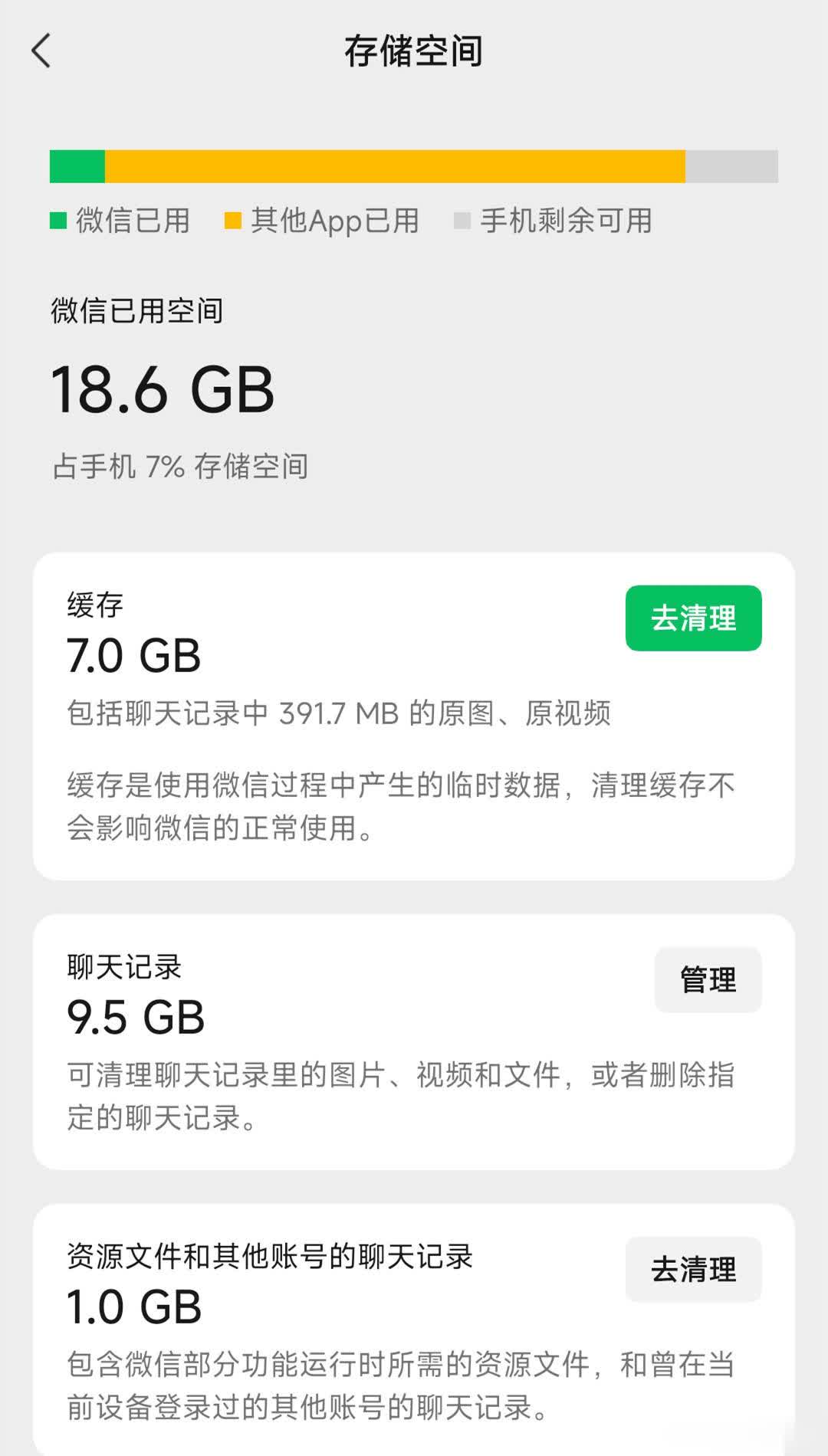 - 隐藏技巧:微信→我→设置→通用→存储空间→【清理】+【管理聊天记录】