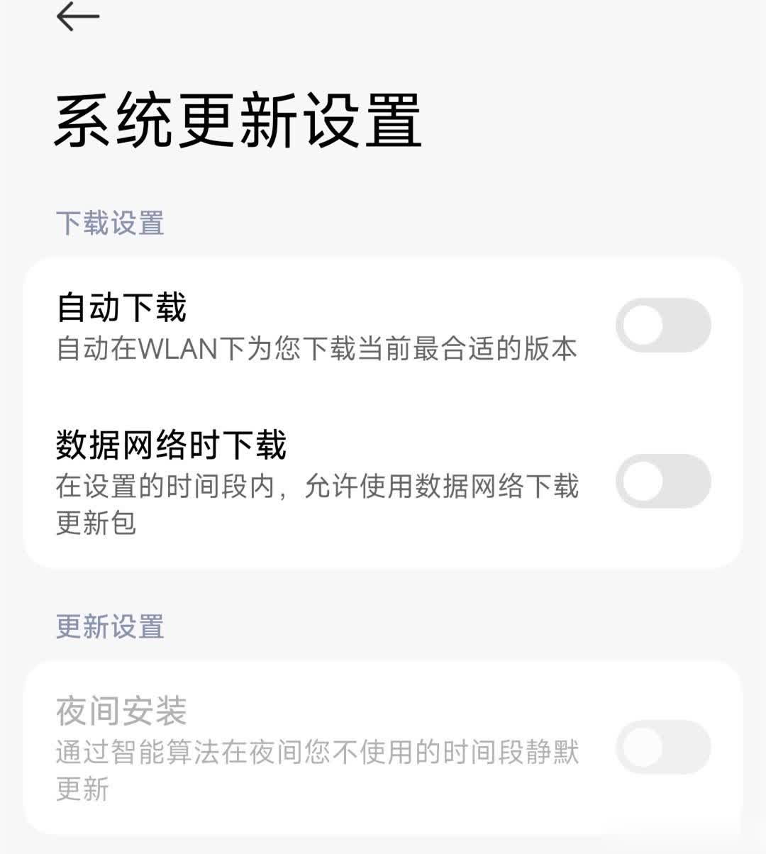 -操作路径:设置→系统更新→关闭【自动下载】+【夜间安装】