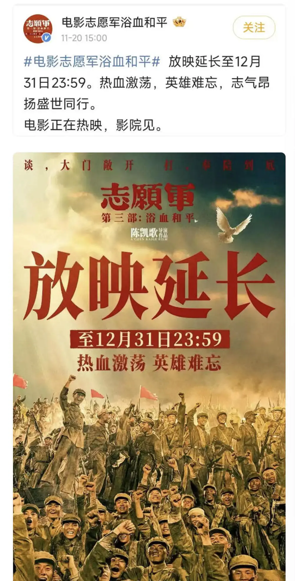 电影《志愿军:浴血和平》是陈凯歌导演的《志愿军》三部曲的收官之作。自9月30日正式公映,10月17日宣布延长放映至11月30日。截至发稿时,该片票房6.34亿元。