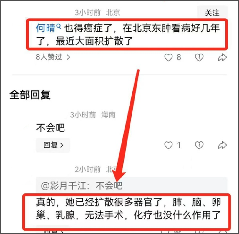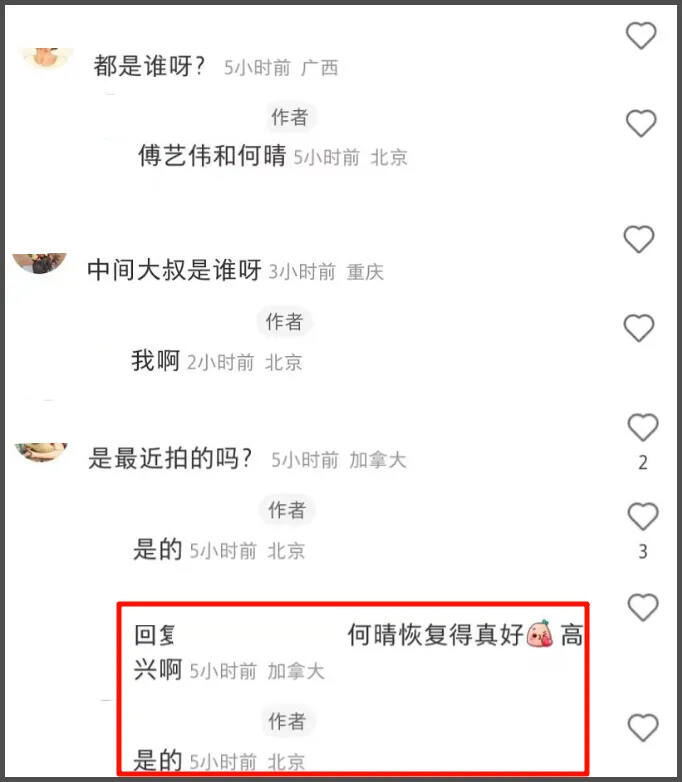 当时还有网友在评论区留言,感叹何晴手术后恢复得不错,真为她高兴,好友还回复说“是的”。