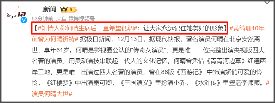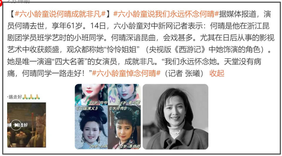 作为唯一演遍四大名著的内娱美女,何晴给观众留下了深刻的印象。何晴讣告曝光之后,六小龄童还在朋友圈发文悼念。